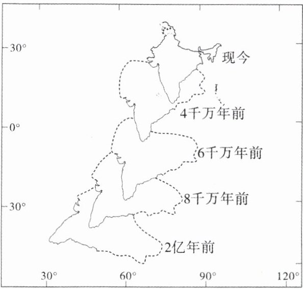 (2024·安徽中考)在地球内力的驱动下,印度古陆漂洋过海,经历了地质历史上漫长的漂泊,终于到达现今的位置。右栏图示意2亿年以来印度古陆不同时期的经纬度位置。据此回答10~11题。