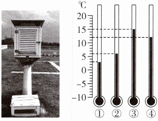 (2024·山西大同期末)气温是地面气象观测中所要测定的常规要素之一。某地理兴趣小组某日开展了气温的测定和记录活动。下图示意百叶箱和测量结果。读图回答 1~2 题。