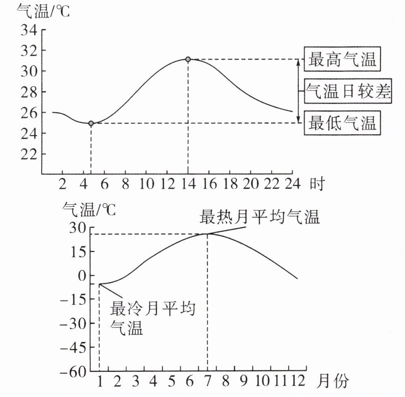 |气温日变化(以 为周期的气温变化)|一天中最高气温出现在 左右,最低气温出现在 前后|