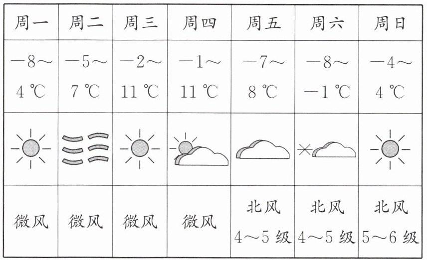 |周日|-4~$4^\circC$| |北风 5~6 级|