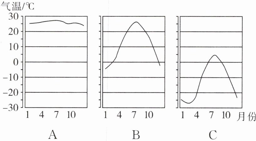 (4)下图示意不同温度带各月气温的变化,能大致反映吉林省气温变化的是 图,气温年较差最小的是 图。