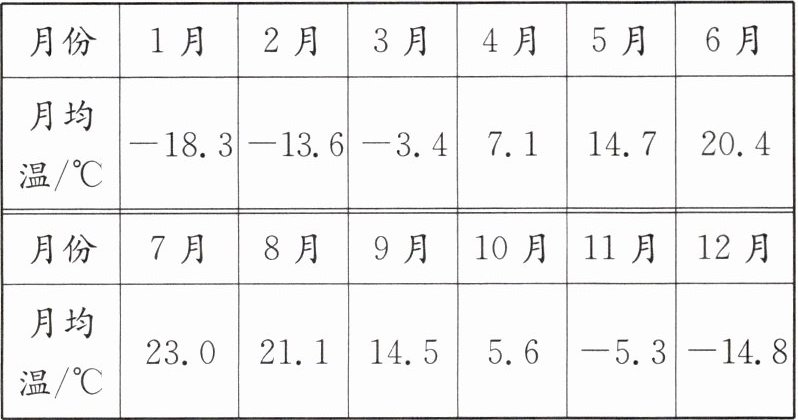 |月均温/$^\circC$|-18.3|-13.6|-3.4|7.1|14.7|20.4|