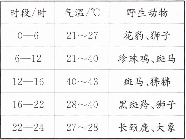 |时段/时|气温/$^\circC$|野生动物|