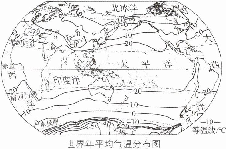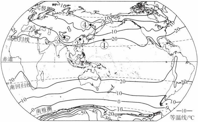3.C 4.C [解析]第 3 题,读图可知:①地所处等温线东西延伸;四地中③地等温线分布最密集;④地年均温低于0℃;③地比周围气温低,处于一个低温中心区。第 4 题,读图可知,等温线数值从低纬向高纬逐渐降低,南半球等温线分布更平直,年均温最低区域在南半球的南极地区。