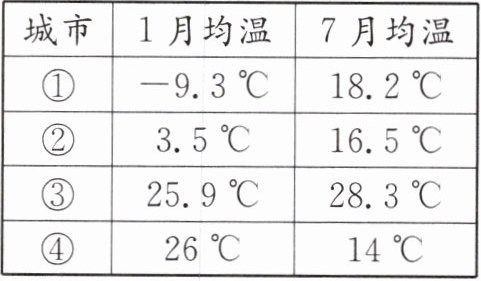 (1)结合图示和表中数据分析,①~④四个城市,1 月均温最低的是______,7 月均温最低的是______,气温年较差最小的是______。