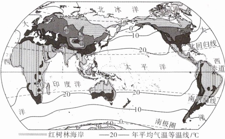 5.C 6.C [解析]第 5 题,读图可知,红树林海岸的分布区域大部分在南、北回归线之间,年平均气温在20℃以上。第 6 题,读图可知,南半球海洋面积广阔,海陆热力性质差异不明显,等温线比较平直;南半球等温线比较平直与地势、平原面积无关;南半球各地获得太阳光热不均匀。