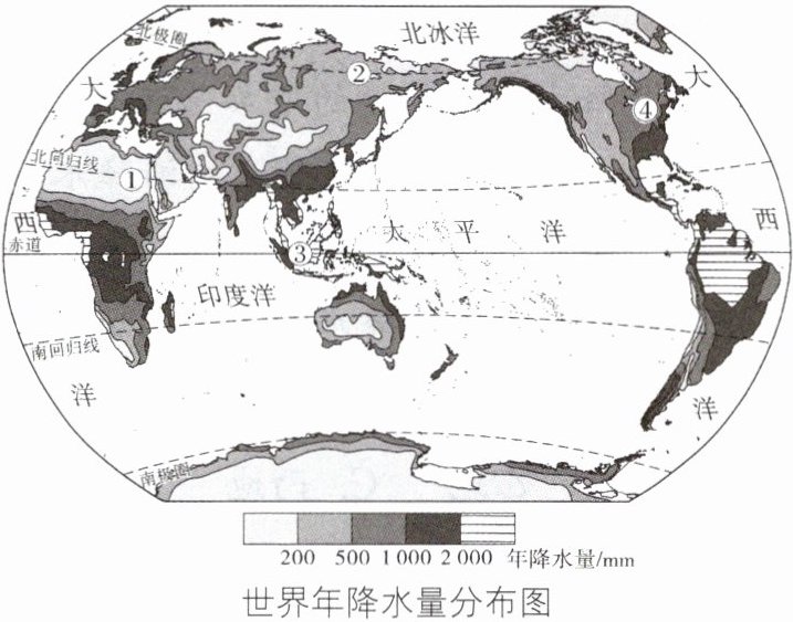 (2025·四川成都期末)随着城市化进程的加速,人们的出行需求也日益增长。然而天气的不确定性常常给人们的出行带来不便。为了解决这一问题,“共享雨伞”应运而生。下图为世界年降水量分布图。据此回答 13~14 题。