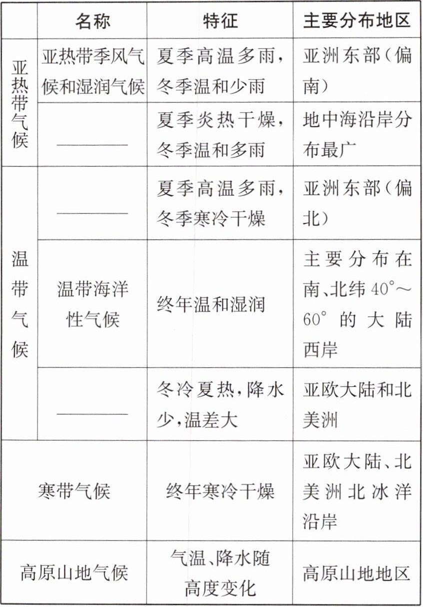 | 温带气候 | ______ | 夏季高温多雨,冬季寒冷干燥 | 亚洲东部(偏北) |