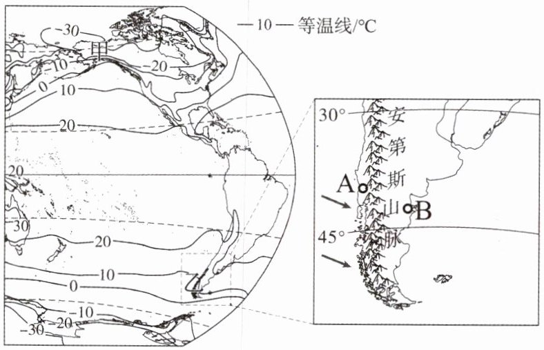 (2025·广东珠海香洲区期末)某探险队1月从阿拉斯加州(图中甲)出发,一路向南穿越美洲,到达阿根廷最南端(图中乙),历时一个月。下图为世界局部地区1月等温线分布图,下页图为A、B两地气温曲线和降水量柱状图。据此回答1~2题。