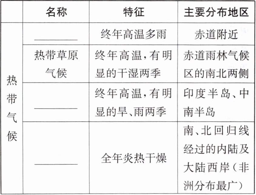 | | ______ | 终年高温,有明显的旱、雨两季 | 印度半岛、中南半岛 |
