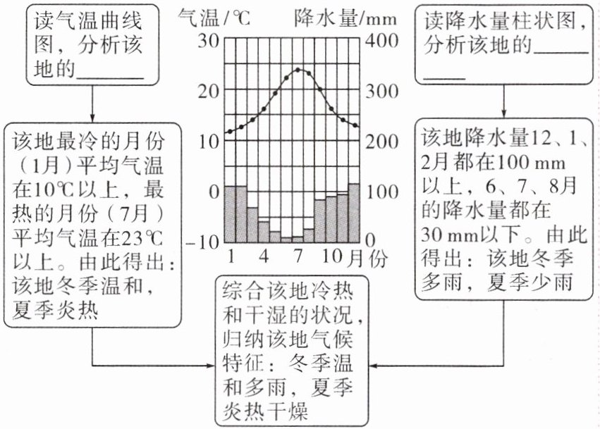 该地最冷的月份(1月)平均气温在10℃以上,最热的月份(7月)平均气温在23℃以上。由此得出:该地冬季温和,夏季炎热 综合该地冷热和干湿的状况,归纳该地气候特征:冬季温和多雨,夏季炎热干燥 该地降水量12、1、2月都在100 mm以上,6、7、8月的降水量都在30 mm以下。由此得出:该地冬季多雨,夏季少雨