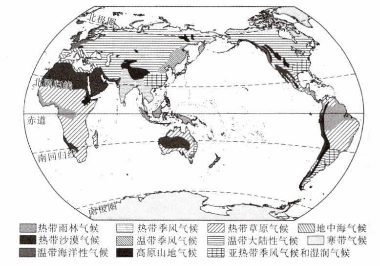 热带雨林气候 热带季风气候 热带沙漠气候 地中海气候 温带季风气候 温带大陆性气候