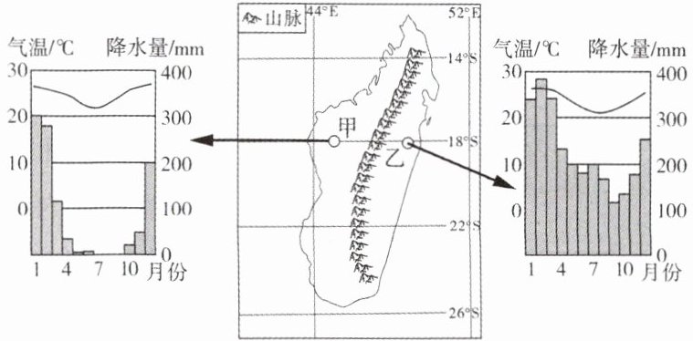(2024·河南驻马店期末)猴面包树是热带稀树草原中一种非常奇特的常绿乔木,树干粗大,喜温耐干,干季时落叶以减少水分蒸发,湿季时可大量储水于树干中。读甲、乙两地位置与气候资料图,回答7~8题。