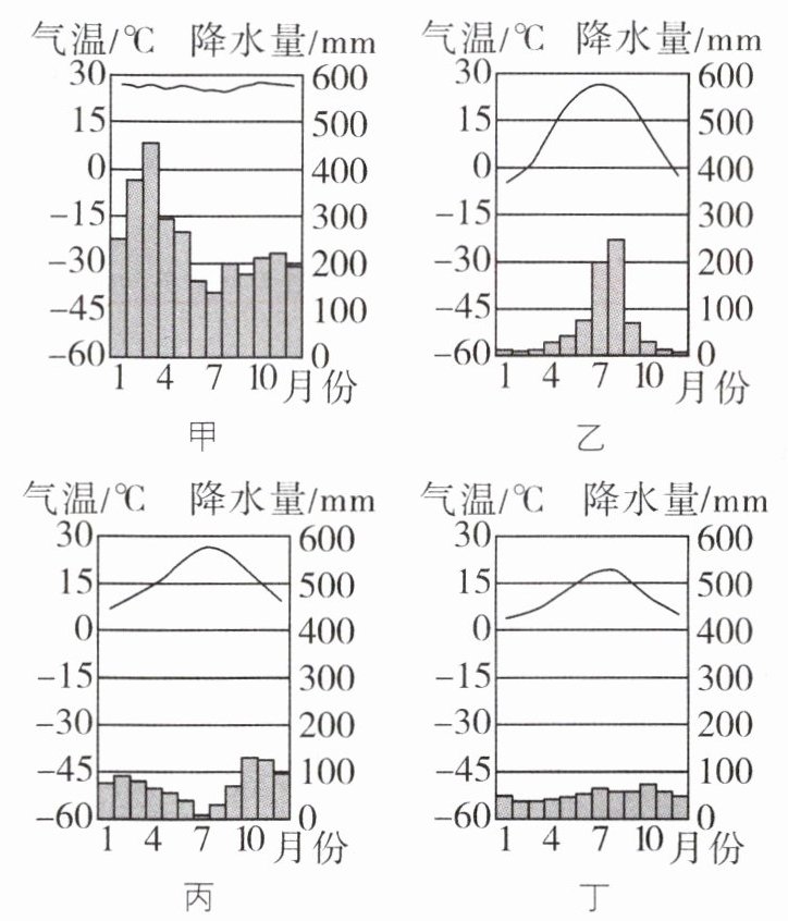 D. 丁气候类型温和湿润,在南美洲西部呈狭长分布
