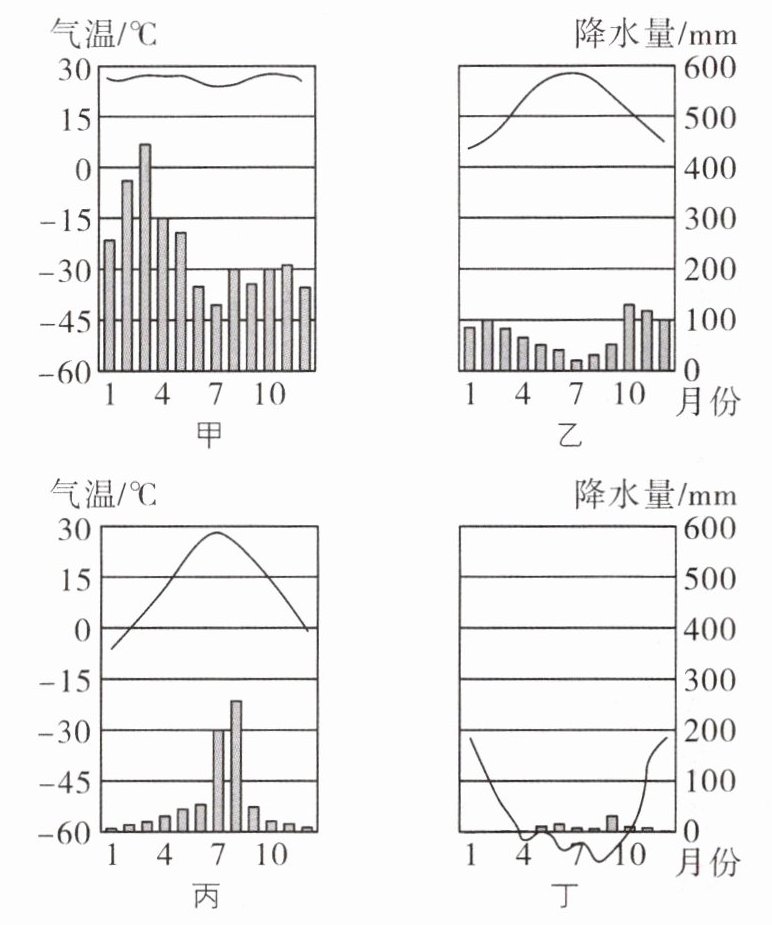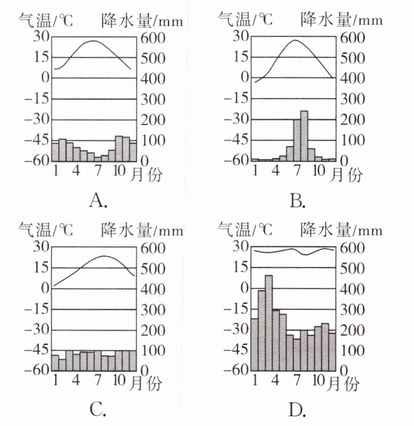 (2024·新疆中考节选)读四地气温曲线与降水量柱状图,回答9~10题。