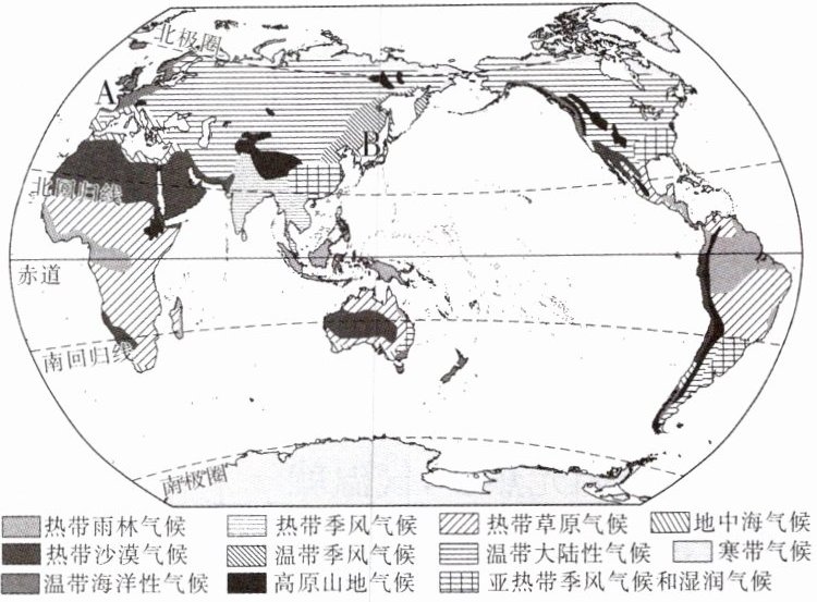(2)小华发现:自亚欧大陆西岸A地到东岸B地的气候类型依次是温带海洋性气候→______气候→______气候。