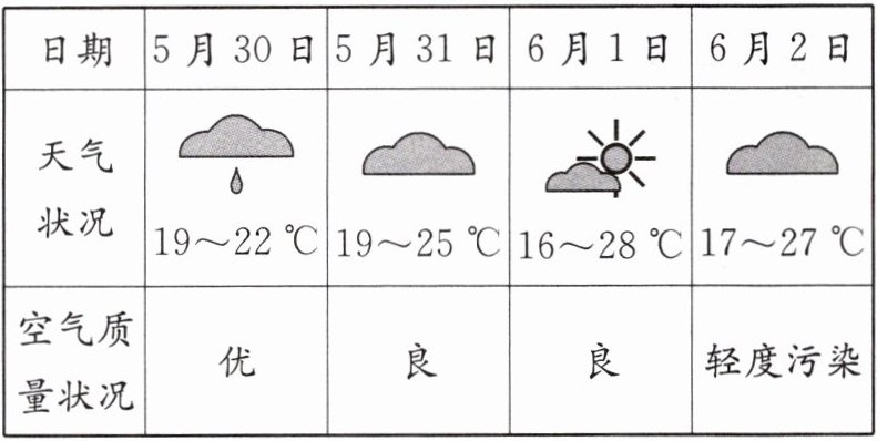 (2024·宿迁中考)下表为某城市5月30日至6月2日的天气状况表。读表回答3~5题。