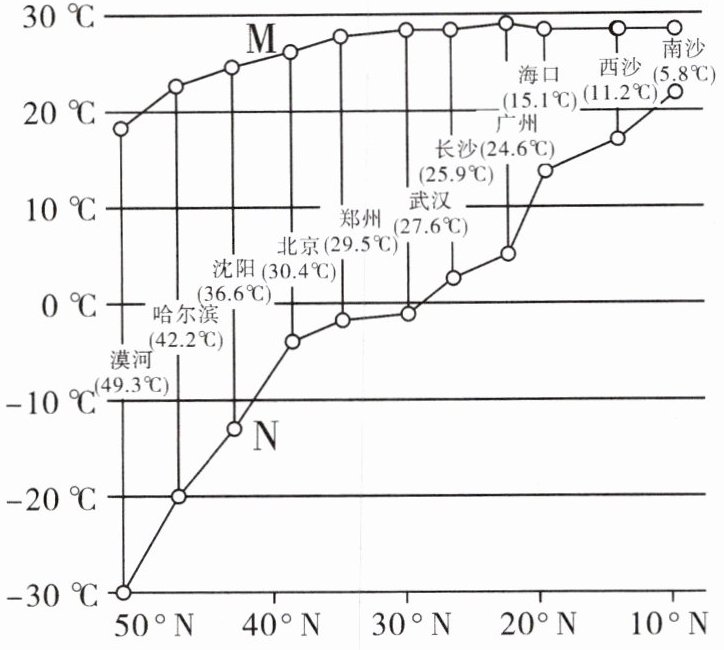 6.C 7.D [解析]第6题,1月代表我国的冬季,平均气温低;7月代表我国的夏季,平均气温高。据图可知,M线的气温高于N线的气温,故M线表示我国东部各地7月平均气温,N线表示我国东部各地1月平均气温。气温年较差是最热月的平均气温与最冷月的平均气温的差。据图可知,纬度越低,气温年较差越小。第7题,据图可知,我国夏季(M线)南北气温差异小,冬季(N线)南北气温差异大;图中没有体现降水信息,也没有反映季风的信息。