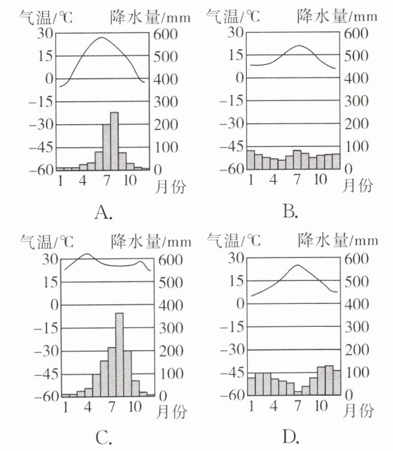 14.C 15.A [解析]第14题,该地1月平均气温低于0℃,降水较少,寒冷干燥,7月平均气温高于20℃,7、8月的月降水量在200mm左右,高温多雨,故该地属于温带季风气候,位于中纬度亚欧大陆东岸;巴西利亚位于热带;地中海气候1月平均气温高于0℃;热带季风气候全年炎热,分旱雨两季。第15题,由上题可知,该地属于温带季风气候,植被多为落叶阔叶林;温带季风气候夏季多雨,民居多为斜顶屋;青藏高原属于高原山地气候,当地传统美食是糌粑;我国西北内陆地区以温带大陆性气候为主,气候干旱,绿洲农业分布广。