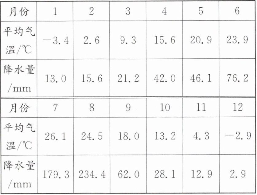 |平均气温/℃|26.1|24.5|18.0|13.2|4.3|-2.9|