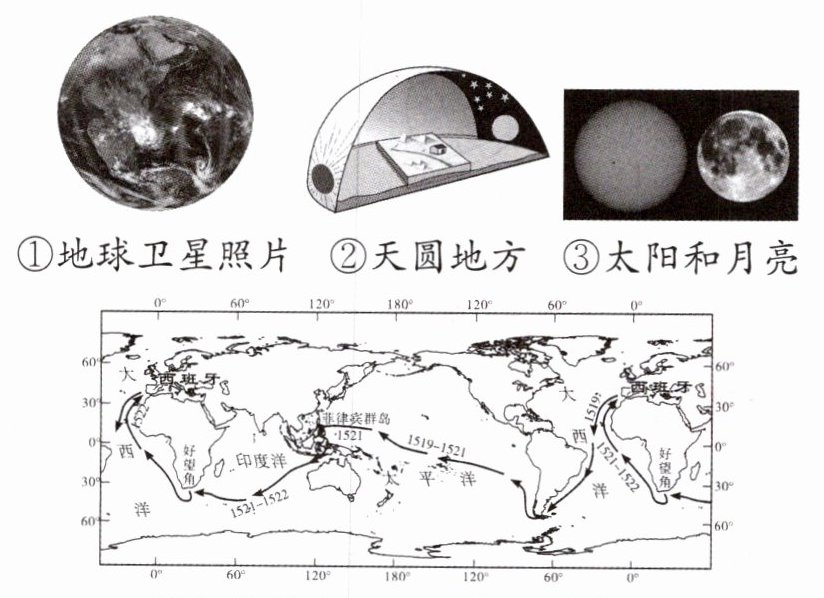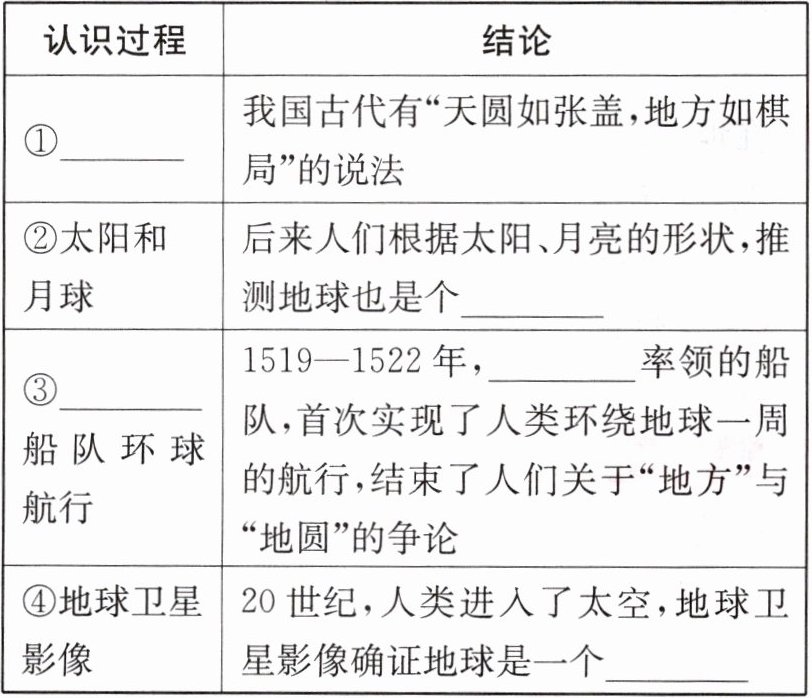 |③______船队环球航行|1519—1522 年,______率领的船队,首次实现了人类环绕地球一周的航行,结束了人们关于“地方”与“地圆”的争论|