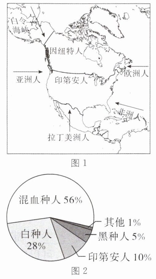 材料三 北美外来移民的来源示意图(图1)、拉丁美洲的种族构成图(图2)