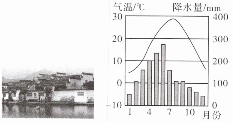 传统文化 皖南古村落 (2024·河南中考)位于群山中的皖南古村落,建筑风格和村落形式独具美感,被誉为“中国画里的乡村”。下图为皖南古村落景观图及当地气候资料图。据此回答 8~9 题。