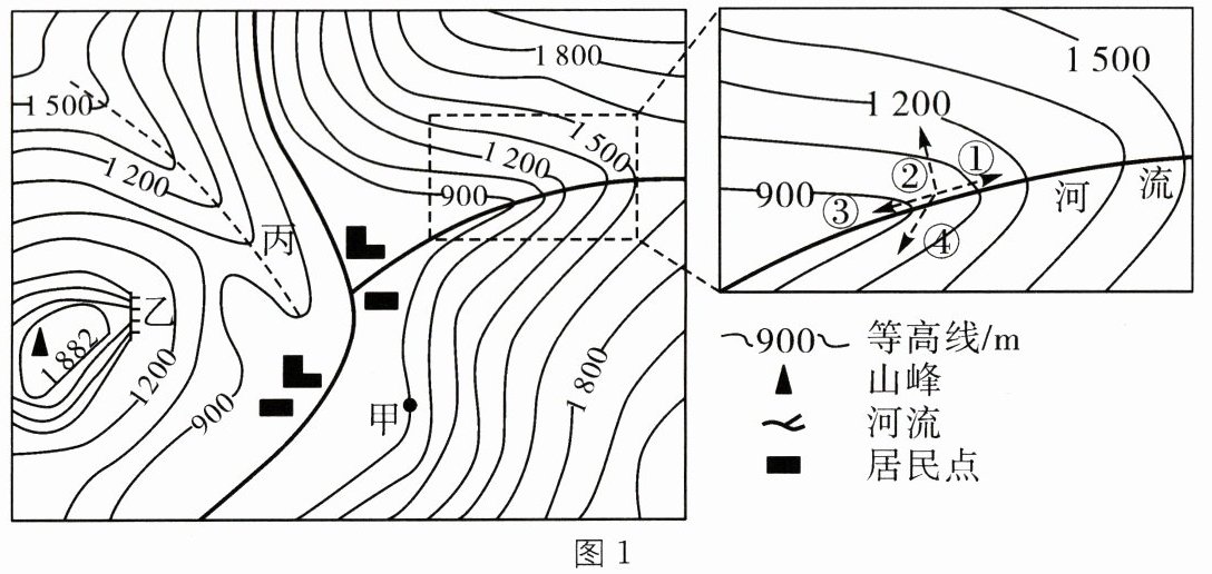 6.B 7.D 8.B [解析]第6题,读图可知,图中的等高距为150 m,甲的海拔为900 m,山峰的海拔为1882 m,则两地的相对高度为1882 m-900 m=982 m。第7题,读图可知:图中乙处为几条海拔不同的等高线重叠的部位,是陡崖;丙处等高线向海拔低处凸出,为山脊。第8题,读图可知,泥石流发生时,①②③④逃生方向中,②逃生方向与泥石流方向垂直,是正确的逃生方向。