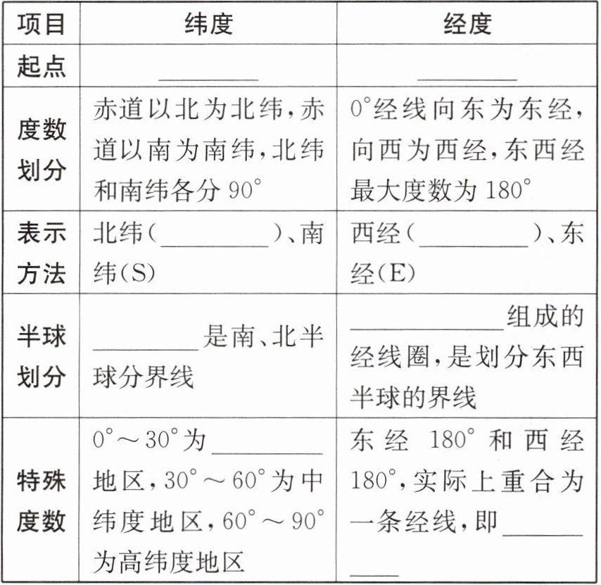 |特殊度数|0°~30°为______地区,30°~60°为中纬度地区,60°~90°为高纬度地区|东经 180°和西经 180°,实际上重合为一条经线,即______|