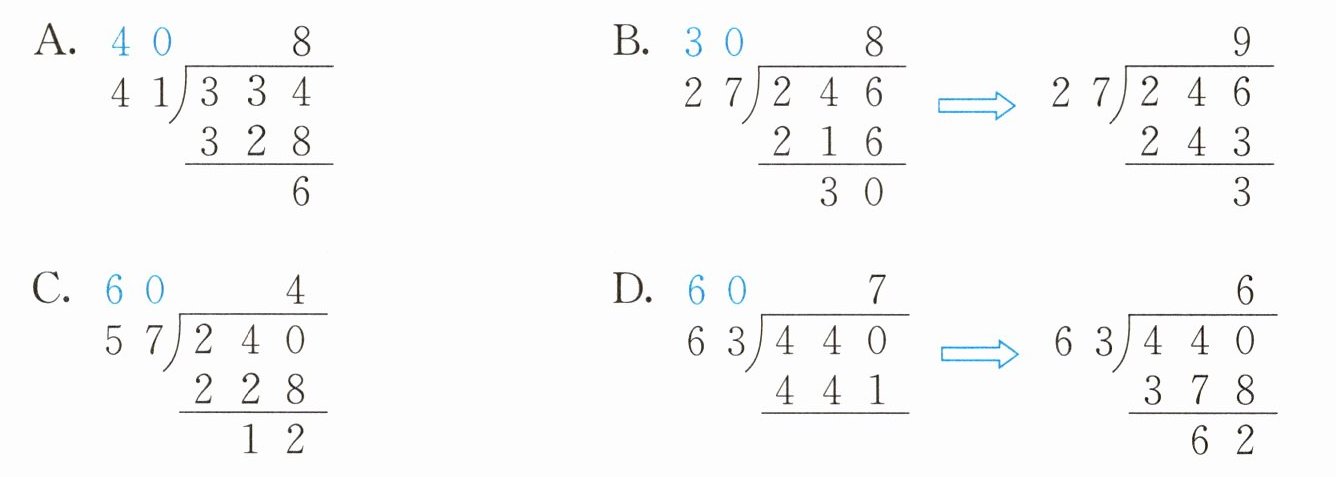 3. 笔算三位数除以两位数,在试商时,如果将除数看小了,那么商可能会偏大。下面选项(