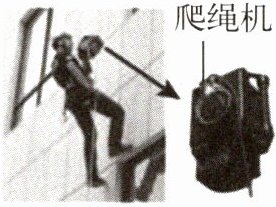 8. 如图是一款爬绳机,这款爬绳机可以不消耗人的体能,轻松攀爬、下降,可用于消防救援、矿井救援及桥梁检测维修等等。爬绳机的质量为10kg,静止在水平地面上时与地面的接触面积为$0.1m^2。$在某次爬升中,将一个质量为70kg的工人从地面匀速提升12m,用时1min。求:(g取10N/kg)