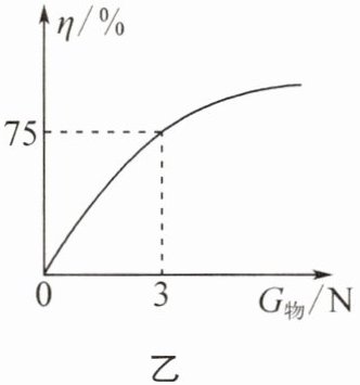 (4) 由图乙知,当$G_{物}=3N$时,$η=75\% $,不计绳重和摩擦时,由$η=\frac {W_{有用}}{W_{总}}×100\% =\frac {G}{G+G_{动}}×100\% $得,$G_{动}=\frac {(1-η)G}{η}=\frac {(1-75\% )×3N}{75\% }=1N$,当$G'_{物}=4N$时,$η'=\frac {G'}{G'+G_{动}}×100\% =\frac {4N}{4N+1N}×100\% =80\% $。