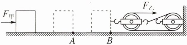 7. 如图所示,甲工人用水平推力 $ F_{甲} $ 推动重为 750 N 的货物,在水平路面上匀速移动 2 m 至仓库门口 A 处,用时 10 s,此过程中甲工人做功的功率 $ P_{甲} = 30 W $;乙工人接着使用滑轮组拉动该货物在同样的路面上匀速移动 3 m 到达指定位置 B,拉力 $ F_{乙} $ 为 80 N。求: