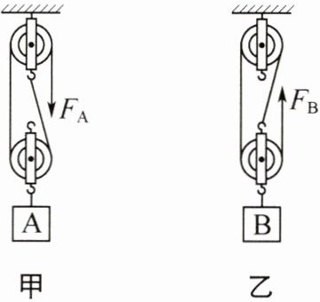 12. 如图所示,用相同的滑轮组成甲、乙两滑轮组,分别用 $ F_{A} $、$ F_{B} $ 匀速提升重力为 $ G_{A} $、$ G_{B} $ 的 A、B 两物体,升高相同的高度,不计绳重和摩擦。若 $ G_{A} = G_{B} $,则 $ F_{A} $