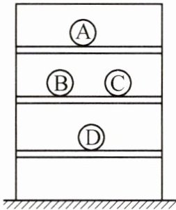 6. 如图所示,货架上放着 A、B、C、D 四个体积相同的实心球,其中 A 和 B 为铅球,C 和 D 为铁球。那么 A、B 两球相比较,