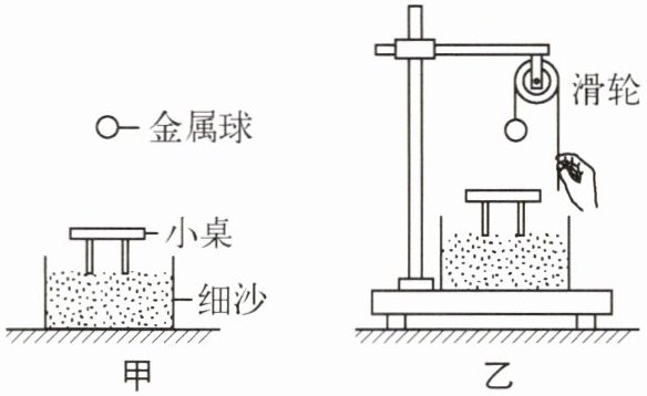 (3)实验时,该同学发现:由于金属球的撞击点偏离桌面中央较大,使小桌倾斜较大,甚至被撞翻,于是他改进了实验装置,如图乙所示,较好地解决了这个问题。他的主要操作是:每次实验时,先拉起金属球,将沙面抹平;