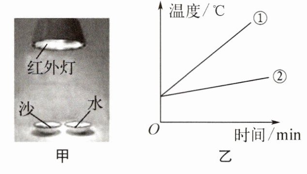 A 提示:由题可知,需要温度计测量温度,托盘天平测量质量,秒表测量时间,A正确;红外灯释放的热量存在损失,不能全部被沙子和水吸收,B错误;加热4 min,热源相同,吸收的热量相同,C错误;水的比热容比沙子的比热容大,吸收相同热量,沙子升温更快,因此①是沙子的升温图线,②是水的升温图线。