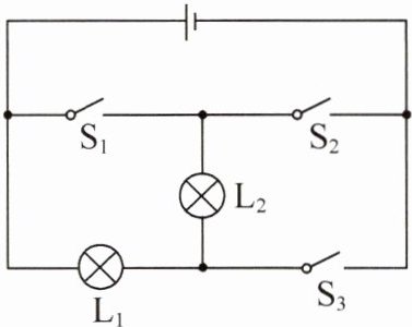 B 提示:闭合开关S₂,断开S₁、S₃时,电流依次流过两灯泡形成通路;闭合开关S₁、S₂时,电流直接从正极通过S₁、S₂流向负极,形成短路,可能烧坏电源;闭合开关S₁、S₃,断开S₂时,电流分别经L₁、L₂和S₁,回到电源负极,L₁和L₂都发光;闭合开关S₂、S₃,断开S₁时,L₂被短路,只有L₁发光。