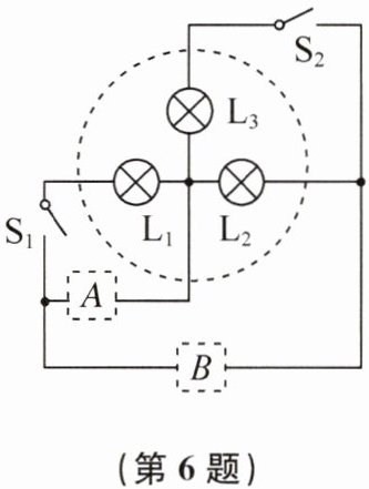 6. (2024·泰州兴化期中)如图所示是一种会变色的灯组结构示意图(虚线圆圈内有三只LED灯),已知$L_{1}$、$L_{2}和L_{3}$分别为红灯、绿灯和蓝灯,要使各灯都能正常工作且互不影响,则三灯应