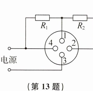 13. (2024·宿迁沭阳月考)如图所示是某家用电器的内部结构电路图,其中$R_{1}和R_{2}$为加热电阻,1、2、3、4分别为四个接线柱。若要让两电阻并联接入电路,可将接线柱1和3连接,同时将接线柱