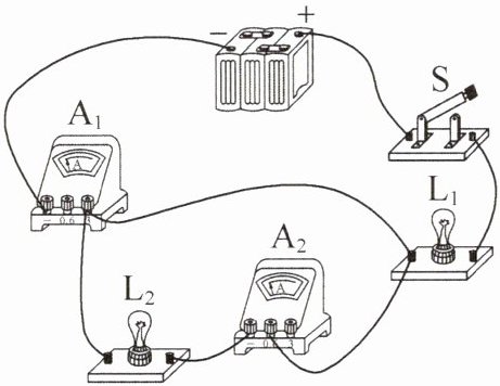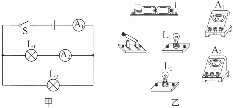 10. 如图甲所示的电路图中,开关闭合时,两灯都亮,此时电流表$A_{1}$的示数为1.2 A,电流表$A_{2}$示数为0.4 A。请用笔画线将图乙所示的实物图连接完整。