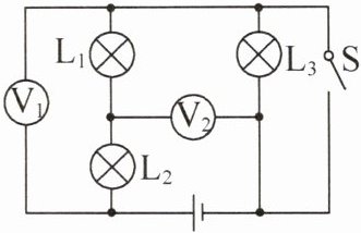 9 3 5.4 提示:开关S闭合时,灯L₃被短路,电压表V₁测电源电压U=9V;开关S断开时,三盏灯串联,电压表V₁测灯L₁、L₂两端的电压,灯L₃两端的电压U₃=9V - 5V=4V;电压表V₂测灯L₁、L₃两端的电压,灯L₂两端的电压U₂=9V - 7V=2V,灯L₁两端的电压U₁=U - U₂ - U₃=9V - 2V - 4V=3V;开关S闭合时,灯L₃被短路,电压表V₂测灯L₁两端的电压U₁'=5.4V。