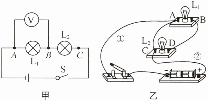 (1)闭合开关S时,两灯都不亮,电压表的示数为0,故障可能是L₂断路。(2)因两灯的电压之和等于L₁和L₂两端的总电压,故串联电路各用电器电压之和等于电源电压。(3)为避免偶然性,应更换不同规格的灯泡多次实验。(4)图乙中电流没有经过用电器,造成电源短路,应将导线②的一端从接线柱C改接到B或D,或将导线①的一端从接线柱A改接到B或D。