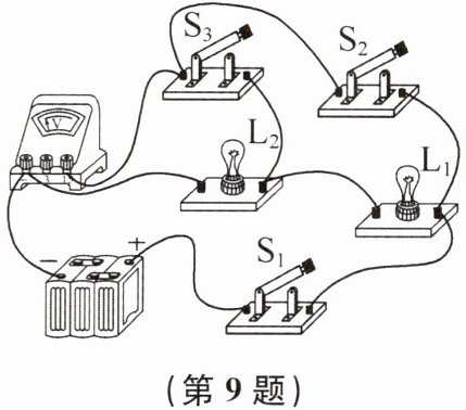 9.(2024·苏州常熟期中)如图所示,电源电压不变,灯$L_1、$$L_2$完全相同。闭合开关$S_1,$断开$S_2、$$S_3,$灯$L_1、$$L_2$是