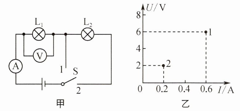 10. 如图甲所示,当开关S由1转到接2时,电压表的示数变化如图乙所示,则灯$L_2$两端的电压是