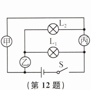 12. 如图所示电路中,电源电压为3V,甲、乙、丙为电流表或电压表,闭合开关S,灯泡$L_{1}$、$L_{2}$正常发光。小明在记录电表示数时漏记了单位,三表示数分别为3、1.4和2.2。