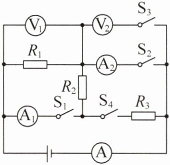 (2)闭合开关S₁、S₂,断开S₃、S₄时,R₁和R₂并联,I₁=0.8 A,电流表A₁测R₂的电流,电流表A₂测干路电流,R₂的电流I₂=I-I₁=1.0 A-0.8 A=0.2 A。闭合开关S₁、S₂、S₄,断开S₃时,R₁,R₂和R₃并联,电流表A₁测R₂、R₃电流,I₂=I₃=0.2 A,电流表A₁示数I'=I₂+I₃=0.2 A+0.2 A=0.4 A。