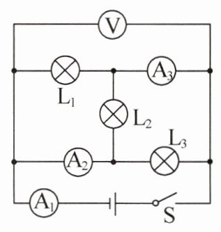 10. 如图所示,当开关S闭合时,电流表$A_{1}$的示数为1.2A,电流表$A_{2}$的示数为1.0A,电流表$A_{3}$的示数为0.6A,电压表的示数为6V。该电路中三个小灯泡的连接方式是