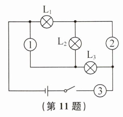 11. (2024·常州天宁模拟)如图所示的电路中,若电表1、2、3均为电流表,表1的示数的1A,表2的示数为2.4A,表3的示数为3A,则$L_{2}$的电流为