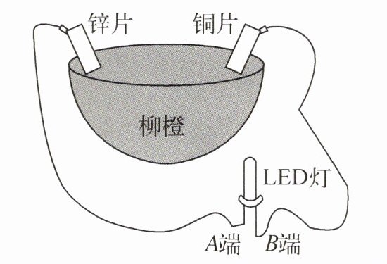 (2) 水果电池提供电能时,把______能转化为电能;LED 灯 A 端短,B 端长,则______(填“铜片”或“锌片”)是电池正极。